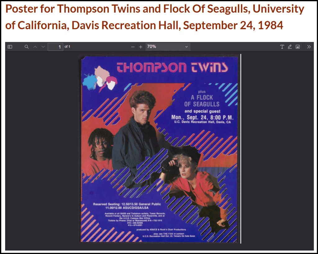 Thompson Twins plus A Flock Of Seagulls and special guest (no idea who this was) on Monday, September 24, 1984 at UC Davis.